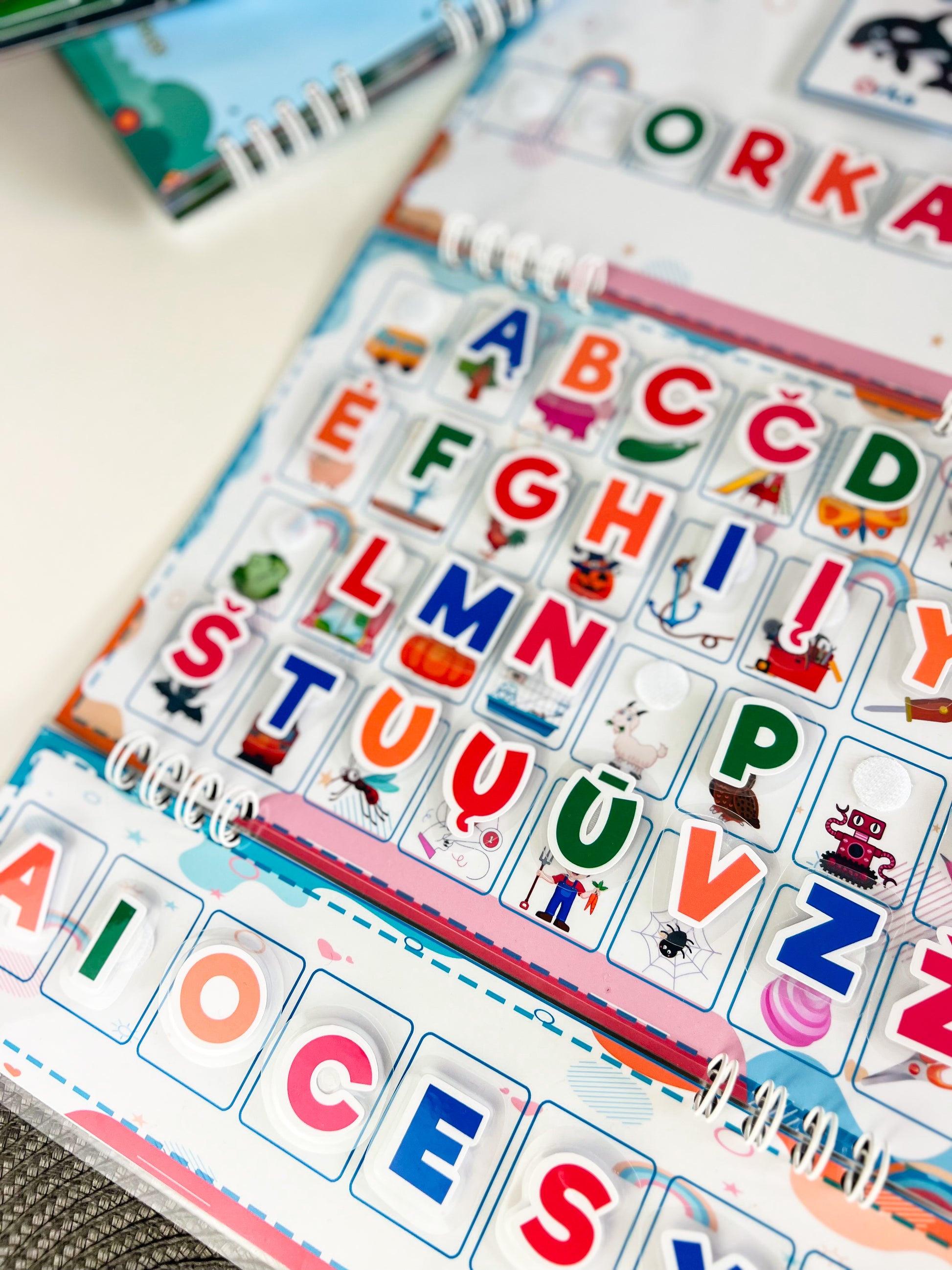 Kiekvieną raidę lydi tinkantis lipdukas ir paveiksliukas, skatinantis mokymąsi per žaidimą.