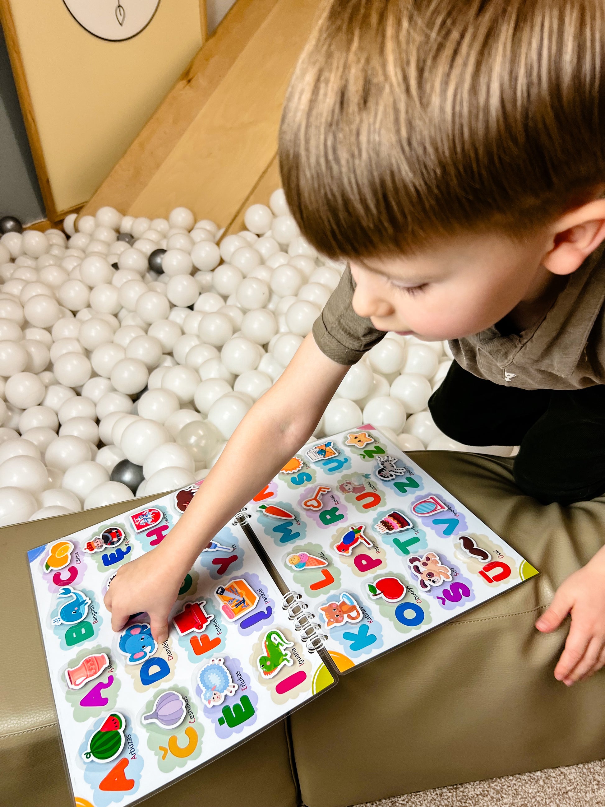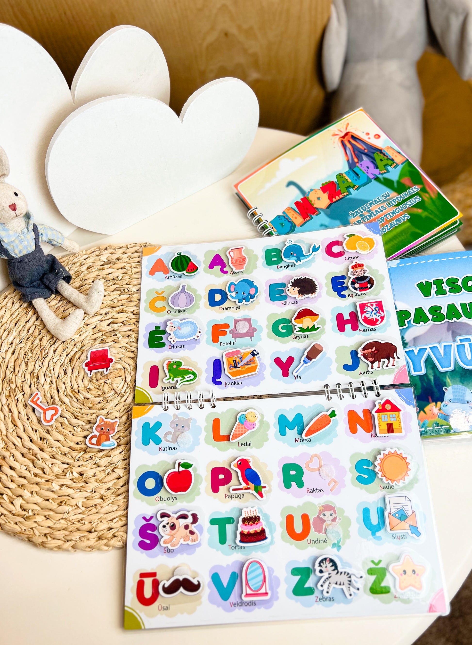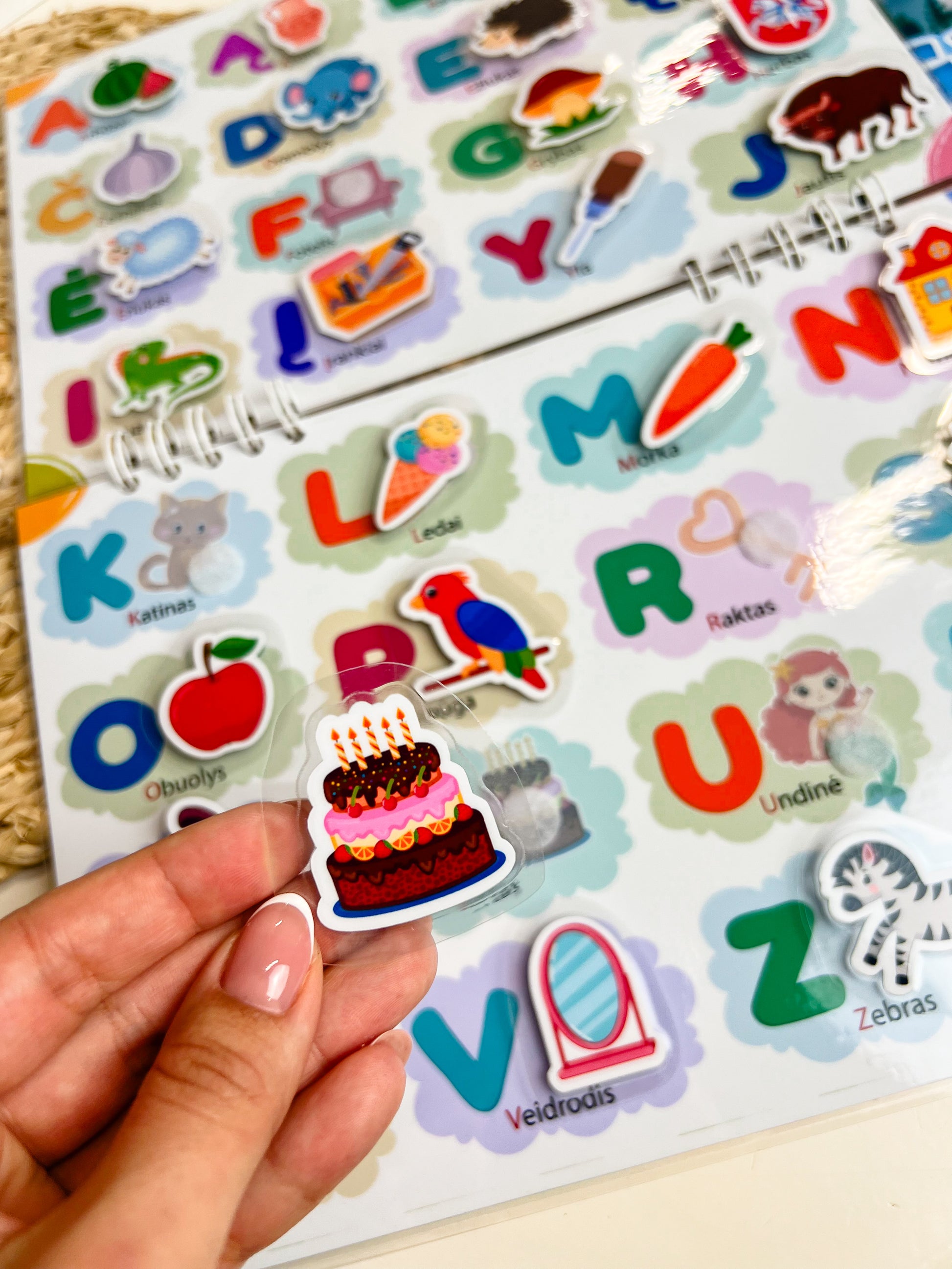 Kiekvieną raidę lydi tinkantis lipdukas ir paveiksliukas, skatinantis mokymąsi per žaidimą.